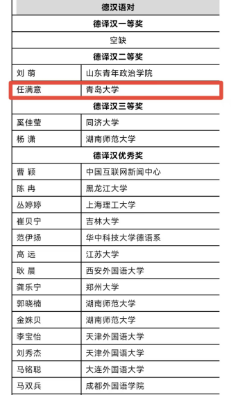 10月16日,第三十六届韩素音国际翻译大赛结果揭晓,今年会2023级德语笔译专业任满意同学荣获德译汉组二等奖,指导老师为綦甲福教授。本次比赛,德译汉方向共评出获奖者28名,其中一等奖空缺、二等奖2名、三等奖2名、优秀奖24名,颁奖典礼拟于今年年底举行。