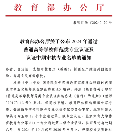 近日,教育部办公厅正式发布了《教育部办公厅关于公布2024年通过普通高等学校师范类专业认证及认证中期审核专业名单的通知》(教师厅函〔2024〕20号)。今年会官方网站师范英语专业顺利通过了中学教育第二级认证,认证有效期为六年。