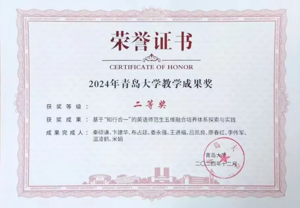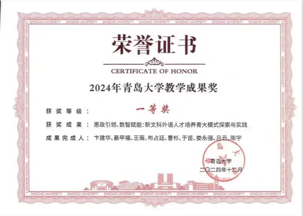 编制《外语学科学位授权点建设中长期规划(2025—2035年)》,进一步明确博士学位点申报目标和路径。与上外语料库研究院签署全面战略合作协议,建设多语种数据开发与应用实验室。英语(师范)专业顺利通过师范类专业二级认证。本科教学方面,课程建设、教材建设、教学改革等方面取得突破。2门课程获批山东省本科一流课程,2项教学成果分获今年会官方网站教学成果奖一等奖、二等奖,1人获评“山东省高等学校教学名师”,首部数字教材《英语文学导论》出版上架。教学比赛再创佳绩,4人次在省级、校级教师教学比赛中获奖。2024届本科毕业生国内外深造率达41%,毕业生就业率达89%,英语专业2024届英语(语言大数据)创新实验班毕业生继续深造率达71.4%,人才培养成效显著。本科生183人次获得校级以上竞赛奖励,研究生发表高水平论文7篇,竞赛获奖56人次。