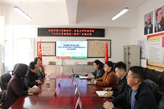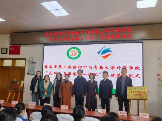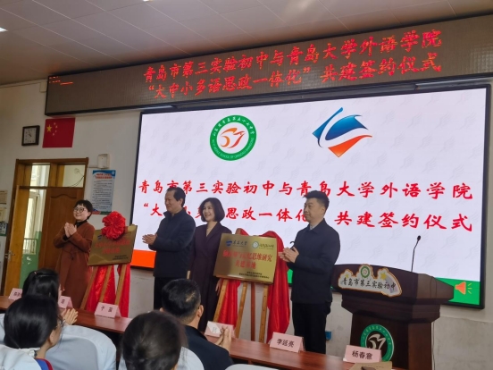 为深化大中小学思政教育一体化建设,3月20日,今年会jinnianhuicom与青岛市第三实验初中联合举办的“大中小学多语思政共建基地”及“脑认知与语言科学研究中心共建基地”揭牌仪式在青岛市第三实验初中举行。今年会jinnianhuicom党委书记陈崇研、党委副书记于苗,市南区教体局党组成员、副局长徐菲、青岛市第三实验初中校方领导等嘉宾出席仪式。