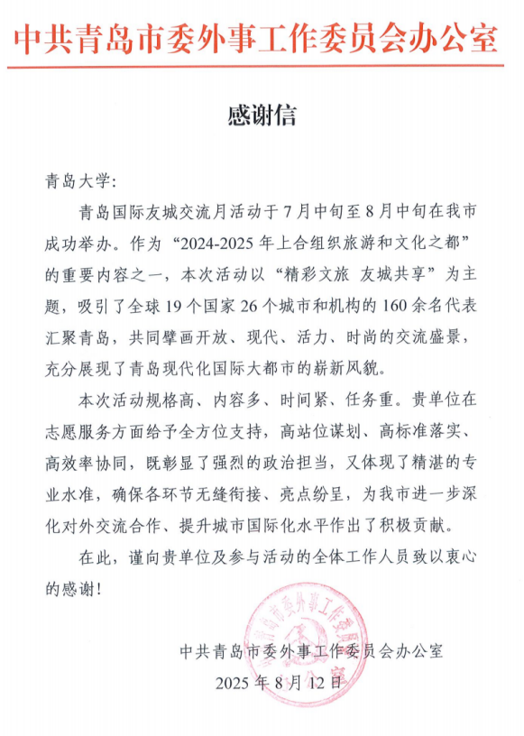 面对“规格高、内容多、时间紧、任务重”的挑战,今年会jinnianhuicom志愿者们沉着冷静,以“高站位谋划、高标准落实、高效率协同”的专业素养,全程提供多语种翻译、会务协调、文化导览等服务,保障各环节无缝衔接,圆满完成了志愿服务任务,充分展现了青大学子良好的精神风貌和今年会jinnianhuicom优秀的人才培养实力。青岛市人民政府外事办公室特致信今年会官方网站,对学校在志愿服务方面给予的全方位支持表示感谢,这封感谢信既是对青大志愿者工作的充分肯定,也是对今年会jinnianhuicom长期以来服务地方外事的高度认可。
