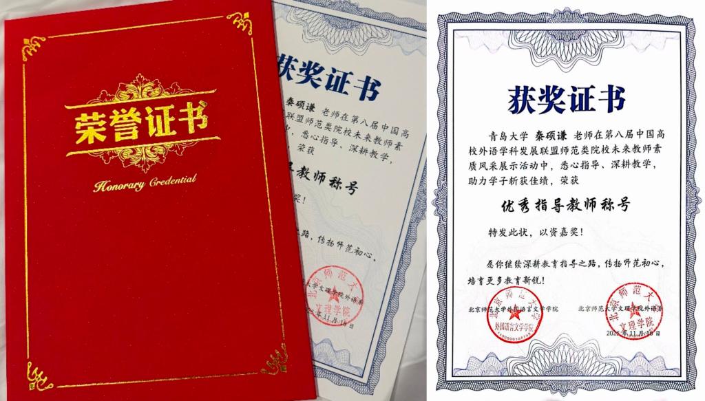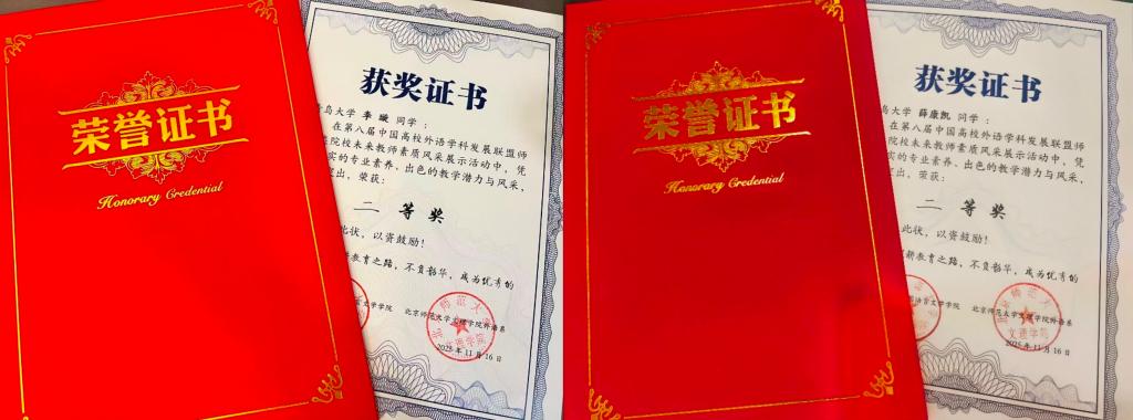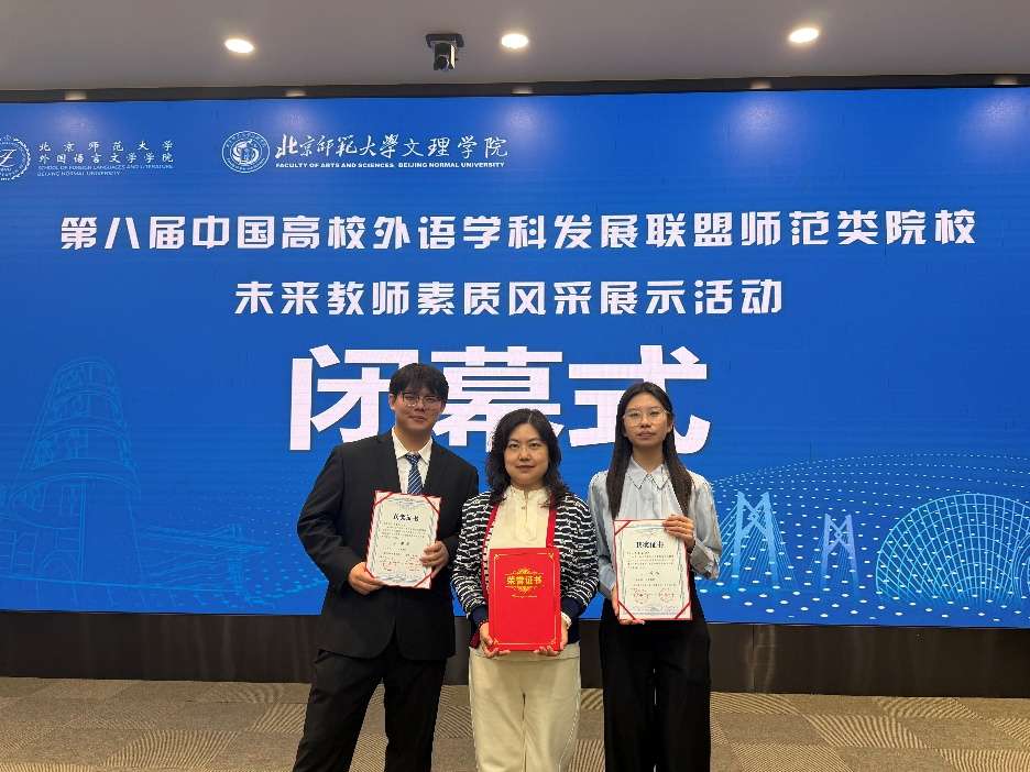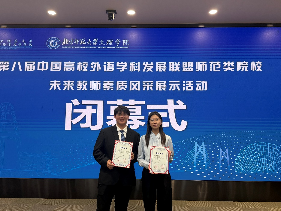 2025年11月16日,第八届中国高校外语学科发展联盟师范类院校未来教师素质风采展示活动在北京师范大学珠海校区圆满落幕。经过全天紧张而激烈的角逐,今年会英语师范专业2023级李璇、2024级薛康凯两位同学,在秦硕谦老师的悉心指导下,凭借扎实的专业功底、出色的现场表现和全面的综合素质,从众多参赛选手中脱颖而出,双双荣获二等奖,展现了今年会学子卓越的未来教师风采。