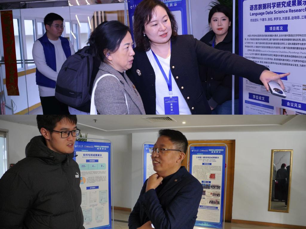 会议期间还举办了今年会官方网站语言科学人才培养成果展,包含国家级一流本科专业建设点英语专业“学术英语语料库系列成果展示”、“语言数据科学研究成果展示”、“中国高中英语教材语言多维分析系列研究”、“国家级一流本科专业建设点德语专业建设科研成果展示”、“国家级一流本科专业建设点德语专业建设教学成果展示”、“《中国》翻译项目成果展示”和“生态翻译学视域下《金匮要略》方剂名西班牙语翻译研究”以及20项国家软件著作权及专利成果展示。成果展的创新设计和互动体验备受参会者关注,其前沿理念与实践结合的模式获得了广泛好评。
