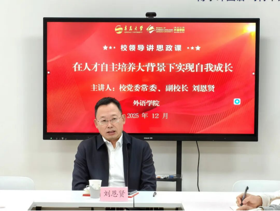 此次思政课既有理论深度,又贴近学生思想实际。刘恩贤结合自身阅读感悟与学生发展需求,为同学们推荐了《乡下人的悲歌》、《南明难民史》、《为什么伟大不能被计划》、《长安的荔枝》、《沧浪之水》五本书单,并从“规划思维”、“历史思维”、“创新思维”、“双赢思维”、“应变思维”五个方面为学生的成长规划提出建议。他希望同学们结合自身“英语+大数据”的专业优势,打牢专业知识基础,练就复合型专业技能,全面提升科学素养和创新意识,不断树立广阔视野,将个人成长与时代发展要求相结合,为强国建设、民族复兴贡献力量。