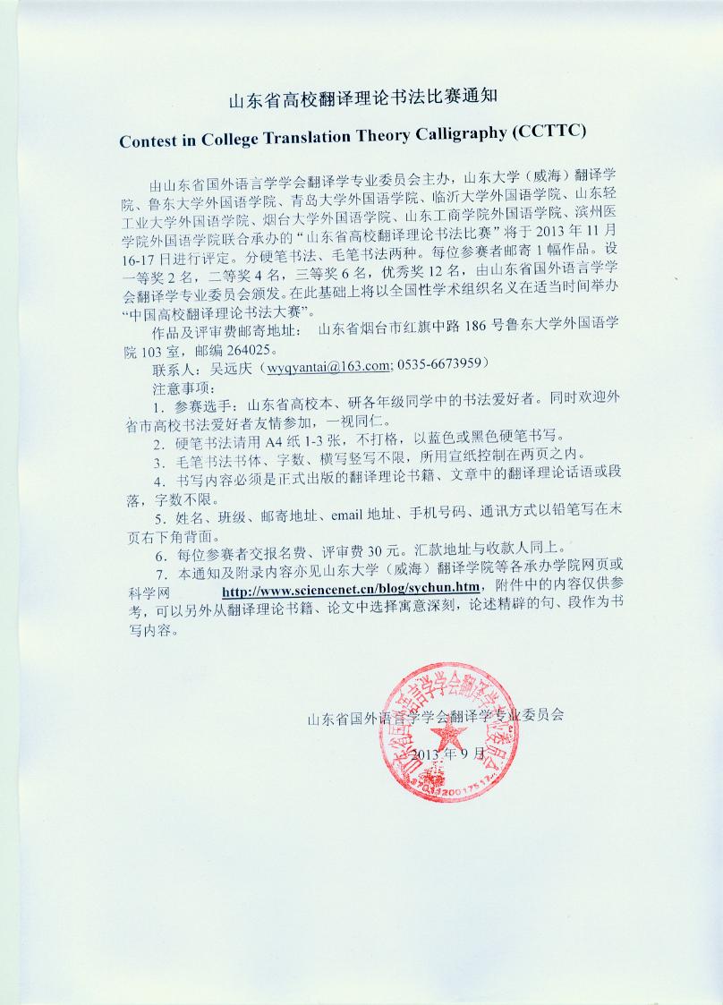 山东省高校翻译理论书法比赛通知(201309).doc